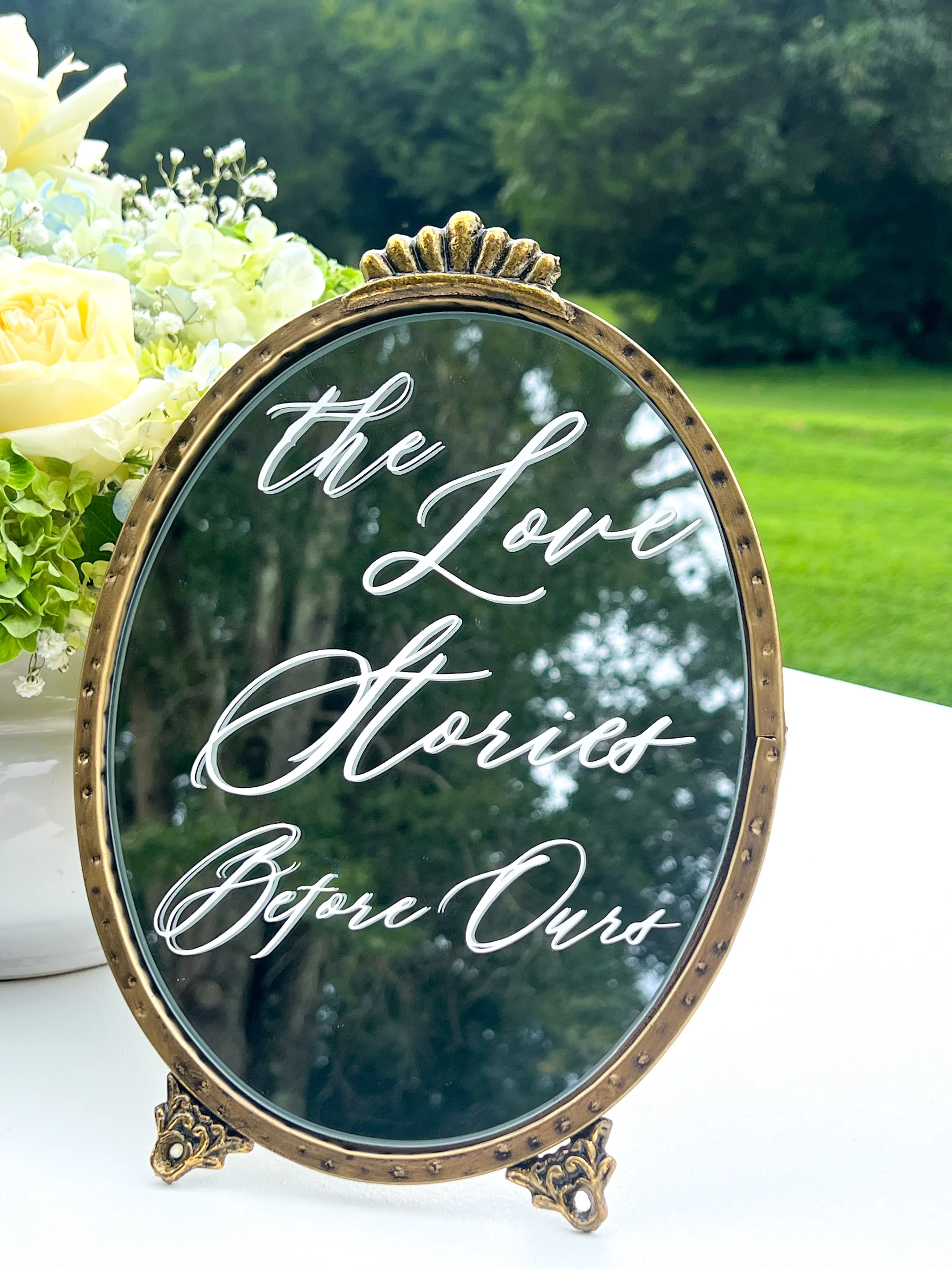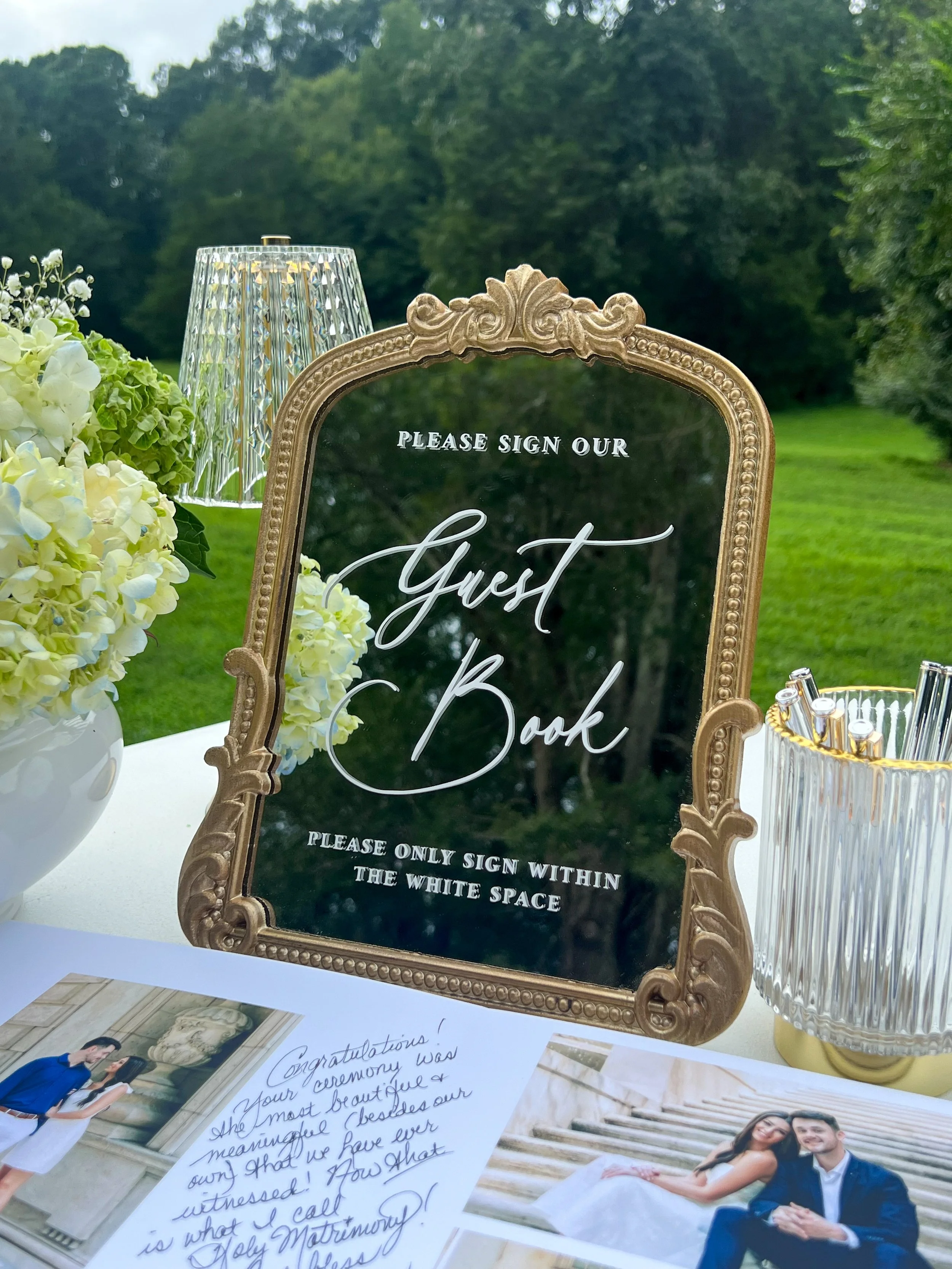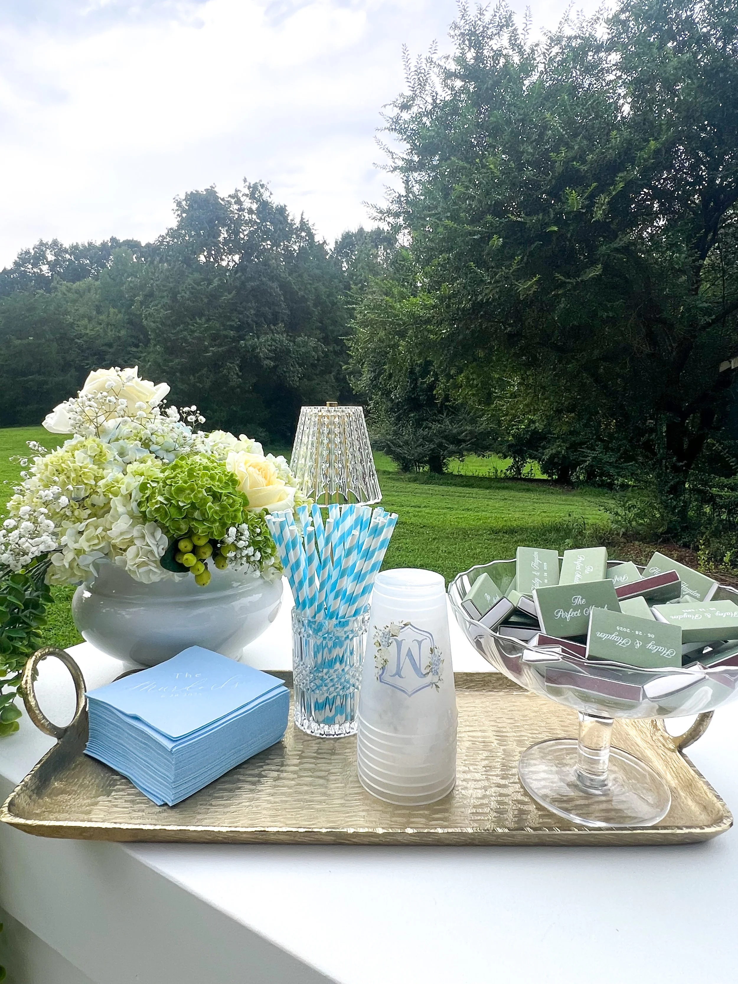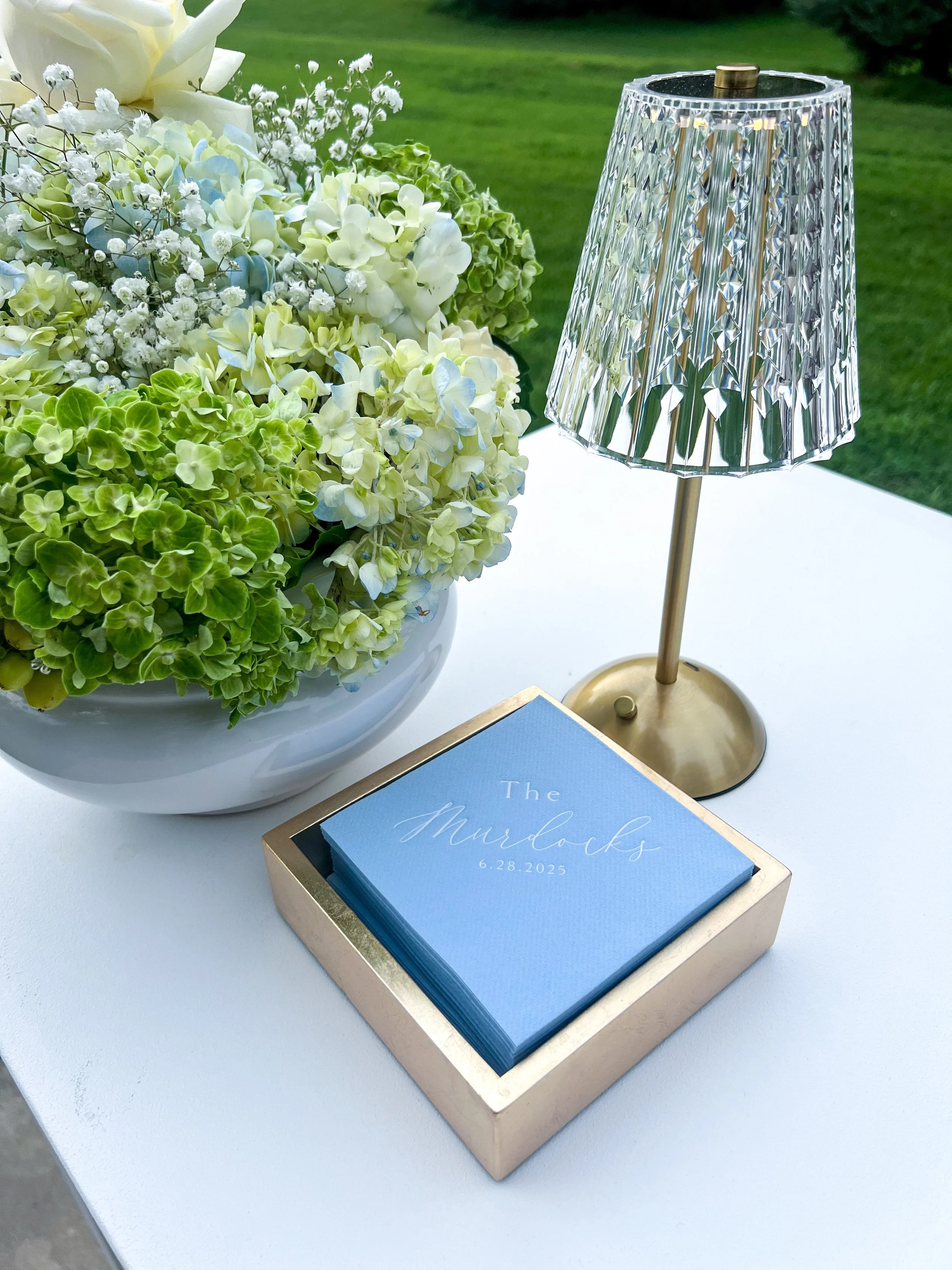A floral arrangement with white roses and blue flowers, a sign listing signature drinks, and a gold and glass table lamp on a white table at an outdoor event.
